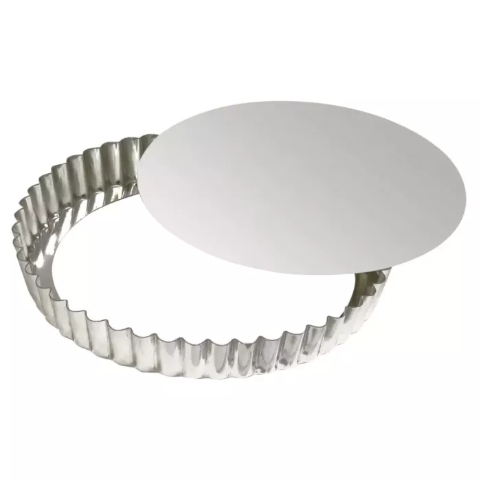 Tin quiche pan with a 10" diameter and 1" depth. Features a removable bottom surface.