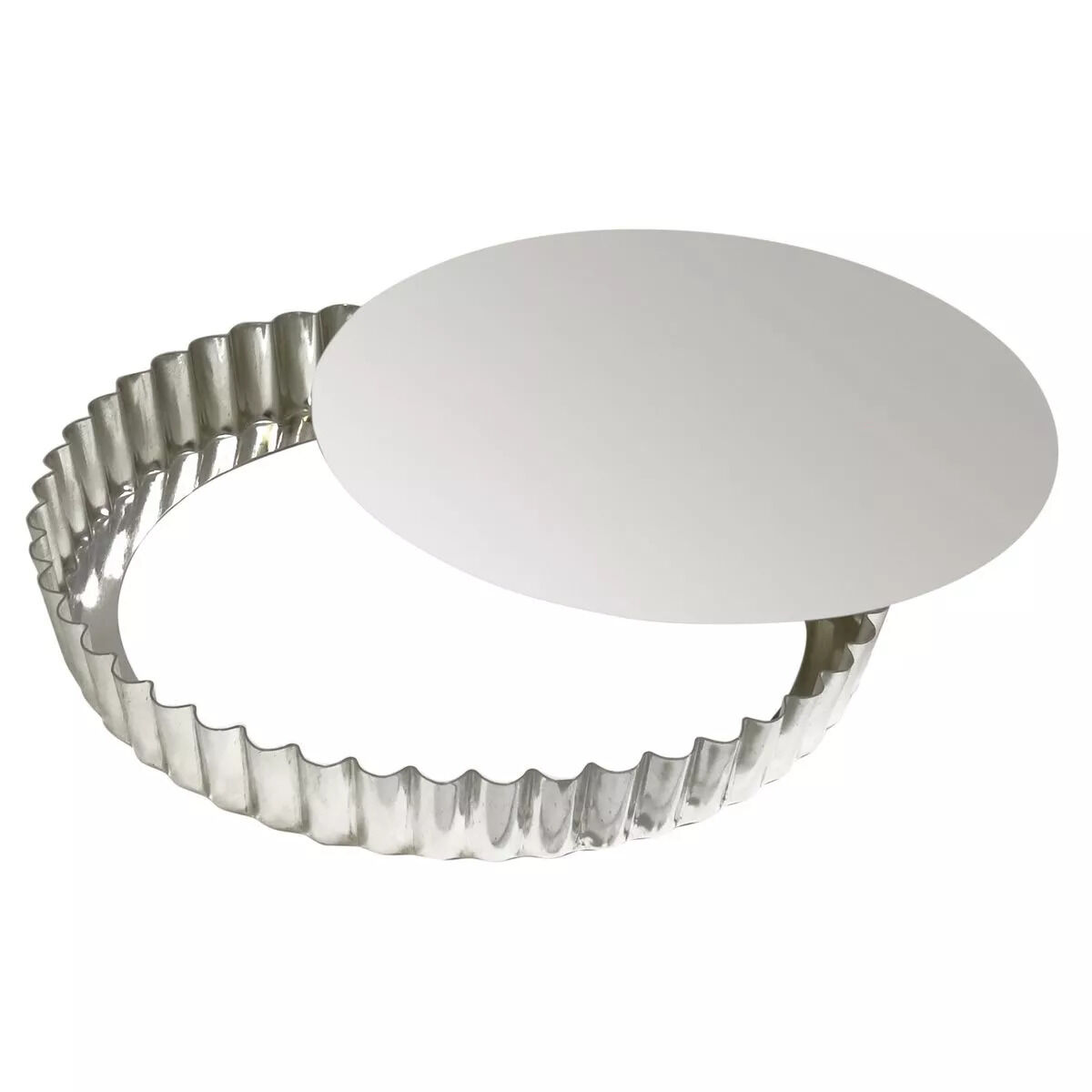 Tin quiche pan with an 11" diameter. 1" depth. Features a removable bottom surface.