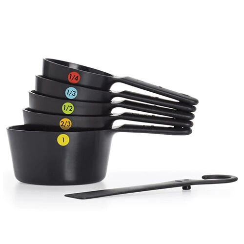 Cups snap together for compact storage. Features a hook for hanging cups and also doubles as a swiper to level ingredients for more accurate measuring. Soft, non-slip handles have permanent brightly colored measurement markings making it easy to find the right measurements.