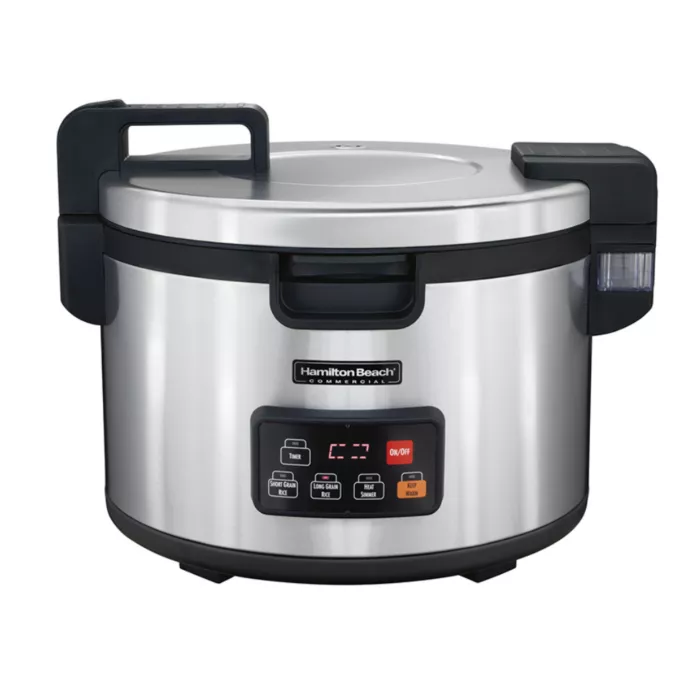 This extra-large capacity Hamilton Beach® Commercial Rice Cooker/Warmer allows the operator to prepare up to 90 cups of cooked rice in one batch.Not only for rice, it can also be used to cook grits, oatmeal, porridge, even macaroni and cheese. Insulated double-wall construction and a heated lid ensure even cooking every time. Just add rice, water, push a button, and walk away. Program settings include long grain rice, short grain rice, and heat/simmer