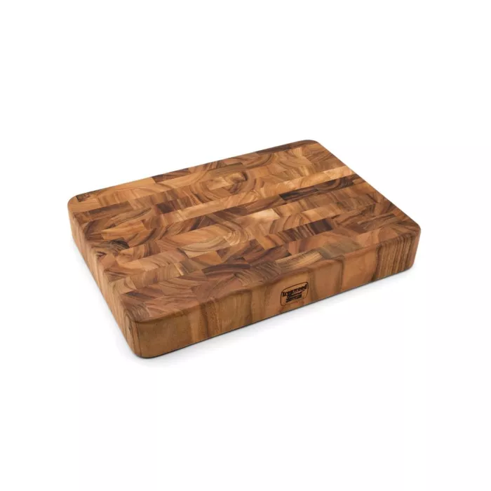A premium cutting board large enough for any job. Crafted from gorgeous acacia wood, this Union Stockyard Butcher Block is functional and beautiful with its rich, shimmering colors. Unlike traditional planks, the fine-grained construction is less dull for cutlery because the grain of the wood adapts to the cut instead of resisting it. Wear is reduced both on the cutlery and on the board, giving more longevity to all your cutting tools. This multi-function board doubles as a prep station, cutting board, and serving board to meet all your cooking needs. Decorative functionality at its best, it's what you deserve.