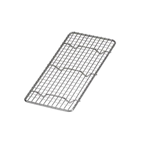 This chrome plated grate is 5 x 10 1/2 inches and fits into a food service standard third-sized bun pan to catch the drips