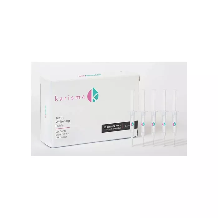 Achieve a dazzling smile with the Karisma 25-Syringe Take Home Tooth Whitening Refill. This refill kit contains 25 syringes, each filled with 3.5mL of 14% hydrogen peroxide whitening gel, providing an effective and convenient solution for at-home tooth whitening.