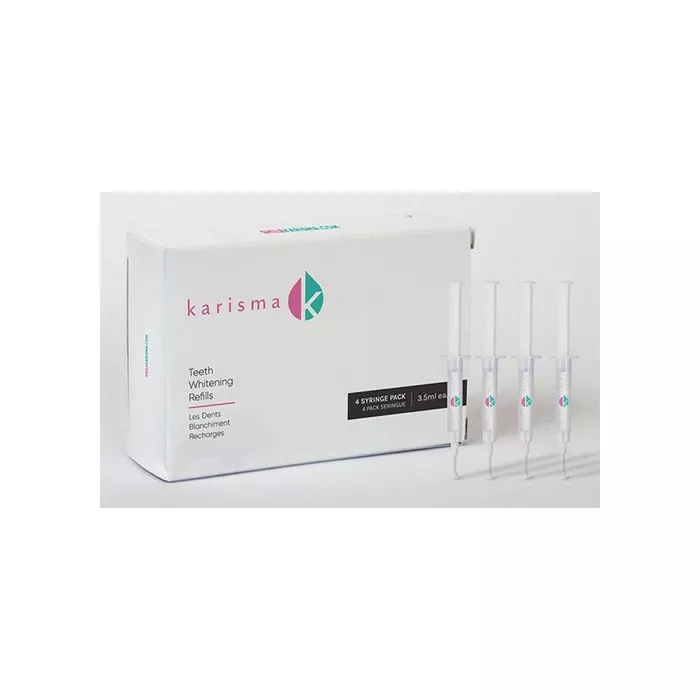 La recharge de blanchiment dentaire Karisma 4-Syringe Take Home est une solution de blanchiment de qualité professionnelle conçue pour les patients souhaitant maintenir ou améliorer leurs résultats de blanchiment à domicile. Ce pack de recharge contient quatre seringues de 3,5 ml chacune, remplies d'un puissant gel de peroxyde de carbamide à 35 %. La formule à haute concentration assure un blanchiment efficace, éliminant les taches et décolorations tenaces et offrant un sourire plus éclatant et plus blanc.