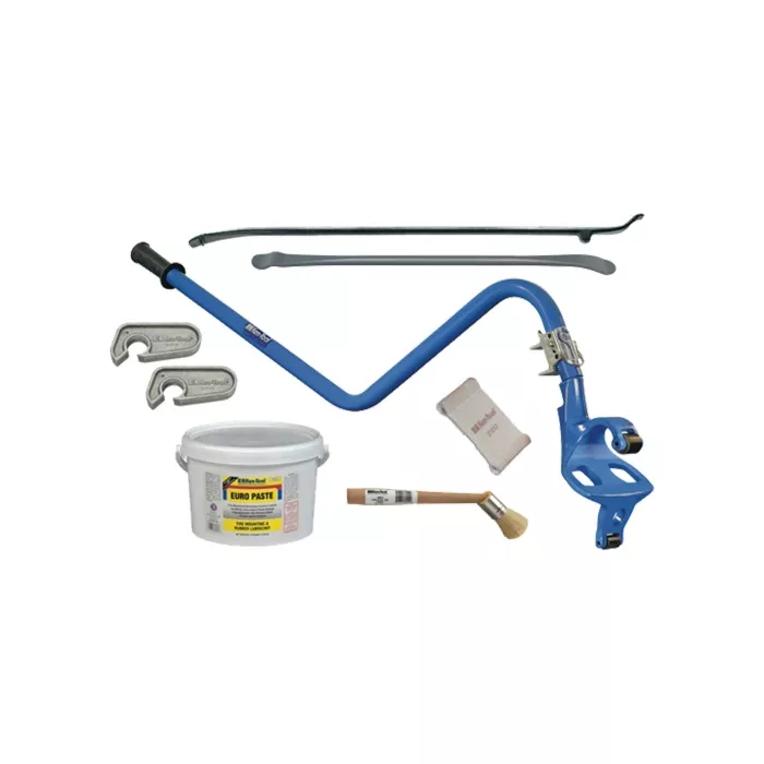 - Comprend: (1) outil de démontage de pneu de camion Blue Cobra(MC), (1) démonte-pneu pour pneu sans chambre à air T45AC Classic(MC), (1) palette à pneu à extrémité double, (1) seau de lubrifiant à base de pâte euro 8 lb, (1) pinceau applicateur de lubrifiant de style européen, (1) support de talon en aluminium C-Lok(MC), (1) protecteur de jante en cuir