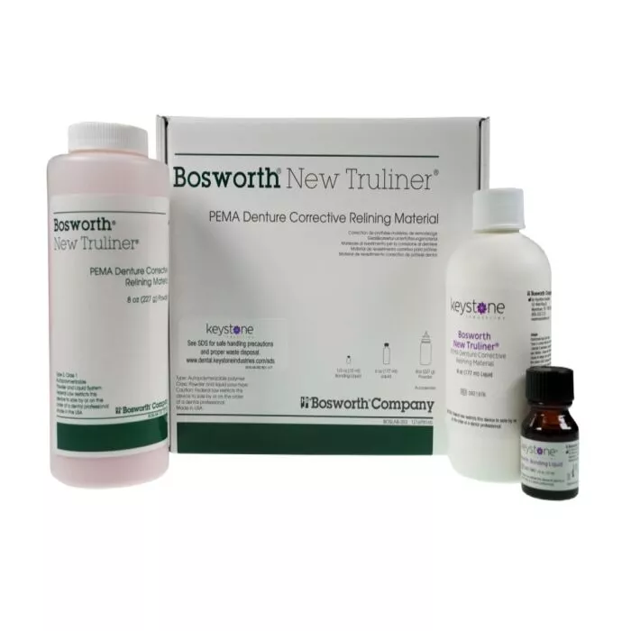 New Truliner PEMA Denture Corrective Relining Material was developed to restore a denture’s original fit in as little as 10 minutes. Color stable and a high density surface guarantee greater patient satisfaction. New Truliner chemically fuses to the denture in 15-20 minutes and is formulated to last up to one year. Once cured, rebased surfaces can be trimmed and polished like the original denture without showing a line of demarcation. Due to reduced heat, best used for the geriatric demographic.