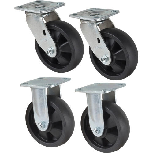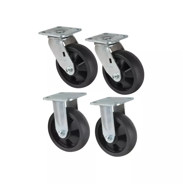 - Comprend deux roulettes fixes et deux roulettes pivotantes