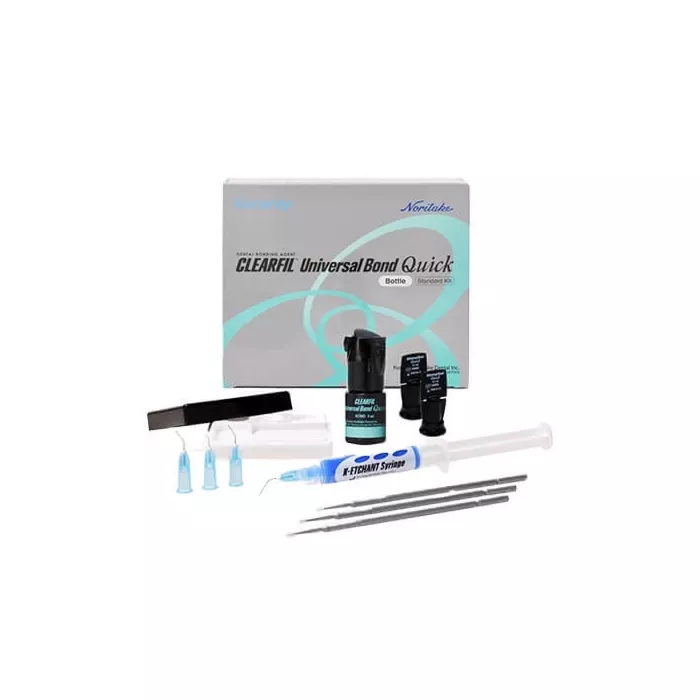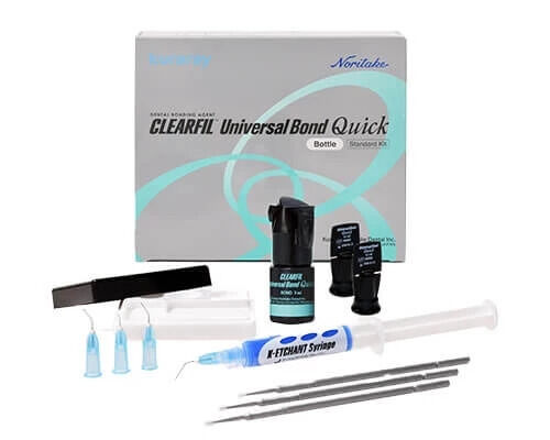 Kit Includes: 1 Bond (5ml), 1 K-ETCHANT Syringe (3ml) 1 mixing dish 1 light-blocking plate applicator brushes (fine-50 pcs) needle tips (20 tips) CLEARFIL Universal Bond Quick is a single-bottle, fluoride-releasing, universal adhesive with the new original MDP & AMIDE-based chemistry that provides a unique RAPID BOND TECHNOLOGY. This new AMIDE monomer rapidly permeates dentin & enamel which eliminates waiting time & dramatically reduces water absorption. It also reduces technique sensitivity & application time without compromising bond strengths, sealing or desensitizing. It's indicated for use with all etching techniques and light, self or dual-cure materials. CLEARFIL Universal Bond Quick offers your practice versatility since it directly bonds to dentin, enamel, metals, zirconia and lithium disilicate restorative materials. CLEARFIL Universal Bond Quick can be mixed with CLEARFIL DC Activator to become a dual-cure adhesive, thereby making this product truly “Universal" for all etching and restorative needs. Universal Use: Can be used for Total-etch, Self-etch and Selective-etch techniques. New original MDP & AMIDE-based chemistry that provides a unique RAPID BOND TECHNOLOGY. No additional primer or activator is needed when used with CLEARFIL DC Core Plus/PANAVIA SA Cement Plus. Bonds to zirconia, metals and silica-based ceramics including lithium disilicate. Works on both wet and dry dentin when using the total-etch technique. No waiting time in both the total-etch and self-etch modes. Can adhere to any material w/o additional primers; no need for separate silane coupling agent. Can be mixed with CLEARFIL DC Activator to become a dual-cure adhesive which can be used with any self/dual-cured resin cement or core material Direct restorations using light-cured composite resin. Cavity sealing as a pretreatment for indirect restorations. Treatment of exposed root surfaces. Treatment of hypersensitive teeth. Intraoral repairs of fractured restorations. Post cementation and core build-ups. Cementation of inlays, onlays, crowns, bridges and veneers. SDS Kuraray Clearfil Universal Bond Quick SDS [ENG] [FR] IFUCLEARFIL UNIVERSAL BOND Quick IFU Download IFUCLEARFIL UNIVERSAL BOND Quick FLOWCHART Download CLEARFIL UNIVERSAL BOND Quick Brochure Download CLEARFIL Universal Bond Quick 98% Overall Independent Rating Download CLEARFIL Universal Bond Quick Five Star Rated Adhesive Download CLEARFIL Universal Bond Quick Rated Highly in CR Clinical Download Dental Advisor Research Report on CLEARFIL Universal Bond Quick Download Visit Dental Advisor Dentistry Today February 2017 Article: RAPID BOND TECHNOLOGY Download Visit Dentistry Today Dentistry Today May 2017 Article: Maximizing the Benefits of Your Universal Adhesive - 5 Things to Know Download