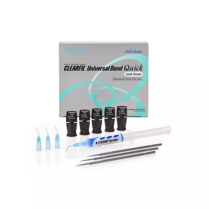 Standard kit Includes: 50 unit doses 1 3 mL K-ETCHANT Syringe 1 mixing dish 1 light-blocking plate 50 fine silver applicator brushes 20 needle tips CLEARFIL Universal Bond Quick is a single-bottle, fluoride-releasing, universal adhesive with the new original MDP & AMIDE-based chemistry that provides a unique RAPID BOND TECHNOLOGY. This new AMIDE monomer rapidly permeates dentin & enamel which eliminates waiting time & dramatically reduces water absorption. It also reduces technique sensitivity & application time without compromising bond strengths, sealing or desensitizing. It's indicated for use with all etching techniques and light, self or dual-cure materials. CLEARFIL Universal Bond Quick offers your practice versatility since it directly bonds to dentin, enamel, metals, zirconia and lithium disilicate restorative materials. CLEARFIL Universal Bond Quick can be mixed with CLEARFIL DC Activator to become a dual-cure adhesive, thereby making this product truly “Universal" for all etching and restorative needs. Universal Use: Can be used for Total-etch, Self-etch and Selective-etch techniques. New original MDP & AMIDE-based chemistry that provides a unique RAPID BOND TECHNOLOGY. No additional primer or activator is needed when used with CLEARFIL DC Core Plus/PANAVIA SA Cement Plus. Bonds to zirconia, metals and silica-based ceramics including lithium disilicate. Works on both wet and dry dentin when using the total-etch technique. No waiting time in both the total-etch and self-etch modes. Can adhere to any material w/o additional primers; no need for separate silane coupling agent. Can be mixed with CLEARFIL DC Activator to become a dual-cure adhesive which can be used with any self/dual-cured resin cement or core material Direct restorations using light-cured composite resin. Cavity sealing as a pretreatment for indirect restorations. Treatment of exposed root surfaces. Treatment of hypersensitive teeth. Intraoral repairs of fractured restorations. Post cementation and core build-ups. Cementation of inlays, onlays, crowns, bridges and veneers. SDS Kuraray Clearfil Universal Bond Quick SDS [ENG] [FR] IFUCLEARFIL UNIVERSAL BOND Quick IFU Download IFUCLEARFIL UNIVERSAL BOND Quick FLOWCHART Download CLEARFIL UNIVERSAL BOND Quick Brochure Download CLEARFIL Universal Bond Quick 98% Overall Independent Rating Download CLEARFIL Universal Bond Quick Five Star Rated Adhesive Download CLEARFIL Universal Bond Quick Rated Highly in CR Clinical Download Dental Advisor Research Report on CLEARFIL Universal Bond Quick Download Visit Dental Advisor Dentistry Today February 2017 Article: RAPID BOND TECHNOLOGY Download Visit Dentistry Today Dentistry Today May 2017 Article: Maximizing the Benefits of Your Universal Adhesive - 5 Things to Know Download
