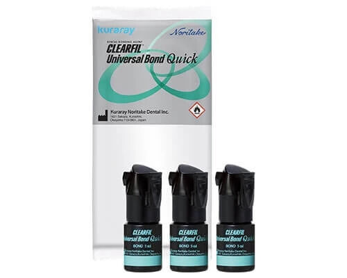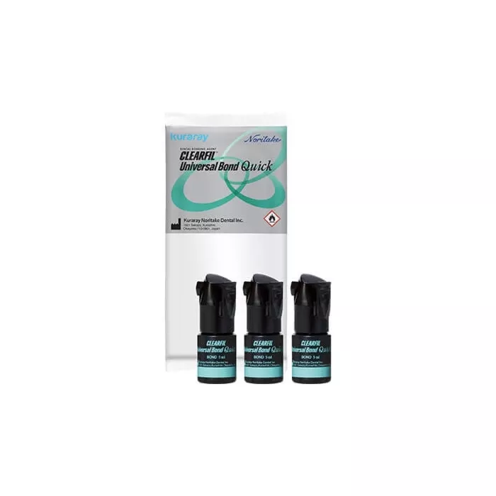 Value kit includes: 3 x 5 mL Bond CLEARFIL Universal Bond Quick is a single-bottle, fluoride-releasing, universal adhesive with the new original MDP & AMIDE-based chemistry that provides a unique RAPID BOND TECHNOLOGY. This new AMIDE monomer rapidly permeates dentin & enamel which eliminates waiting time & dramatically reduces water absorption. It also reduces technique sensitivity & application time without compromising bond strengths, sealing or desensitizing. It's indicated for use with all etching techniques and light, self or dual-cure materials. CLEARFIL Universal Bond Quick offers your practice versatility since it directly bonds to dentin, enamel, metals, zirconia and lithium disilicate restorative materials. CLEARFIL Universal Bond Quick can be mixed with CLEARFIL DC Activator to become a dual-cure adhesive, thereby making this product truly Universal for all etching and restorative needs. Universal Use: Can be used for Total-etch, Self-etch and Selective-etch techniques. New original MDP & AMIDE-based chemistry that provides a unique RAPID BOND TECHNOLOGY. No additional primer or activator is needed when used with CLEARFIL DC Core Plus/PANAVIA SA Cement Plus. Bonds to zirconia, metals and silica-based ceramics including lithium disilicate. Works on both wet and dry dentin when using the total-etch technique. No waiting time in both the total-etch and self-etch modes. Can adhere to any material w/o additional primers; no need for separate silane coupling agent. Can be mixed with CLEARFIL DC Activator to become a dual-cure adhesive which can be used with any self/dual-cured resin cement or core material Direct restorations using light-cured composite resin. Cavity sealing as a pretreatment for indirect restorations. Treatment of exposed root surfaces. Treatment of hypersensitive teeth. Intraoral repairs of fractured restorations. Post cementation and core build-ups. Cementation of inlays, onlays, crowns, bridges and veneers. SDS Kuraray Clearfil Universal Bond Quick SDS [ENG] [FR] IFUCLEARFIL UNIVERSAL BOND Quick IFUDownload IFUCLEARFIL UNIVERSAL BOND Quick FLOWCHARTDownload CLEARFIL UNIVERSAL BOND Quick Brochure Download CLEARFIL Universal Bond Quick 98% Overall Independent Rating Download CLEARFIL Universal Bond Quick Five Star Rated Adhesive Download CLEARFIL Universal Bond Quick Rated Highly in CR Clinical Download Dental Advisor Research Report on CLEARFIL Universal Bond Quick Download Visit Dental Advisor Dentistry Today February 2017 Article: RAPID BOND TECHNOLOGY Download Visit Dentistry Today Dentistry Today May 2017 Article: Maximizing the Benefits of Your Universal Adhesive – 5 Things to Know Download