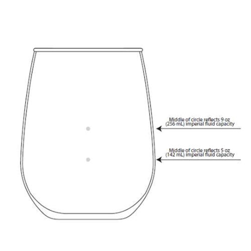 1. Capacity: The Libbey® Stemless Wine Glass has a capacity of 21.75 ounces (644 mL), offering ample space to accommodate your preferred wine serving size. The glass features clear markings at 5 oz (148 mL) and 9 oz (266 mL), enabling you to pour precise amounts with ease.
