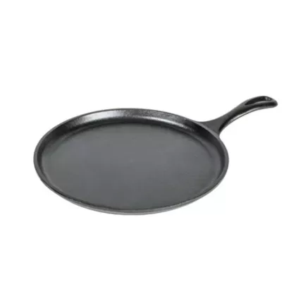 The 10.5 Inch Cast Iron Griddle has slightly raised edges to keep oil, batter, and other ingredients neatly contained. The easy-grip handle allows for better control and hanging storage. It provides excellent heat distribution and retention for consistent, even cooking. Seasoned and ready to use.