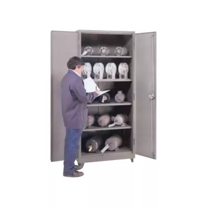 - Acier soudé de calibre 14 avec des portes et des tablettes de calibre 14 qui s'ajustent tous les 3"