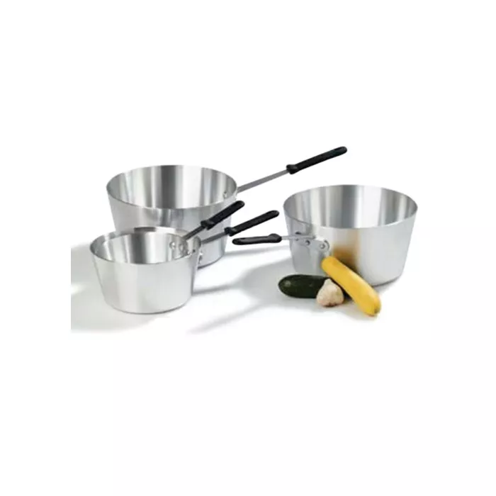Developed to meet rigid industry standards. Sauce pan, tapered aluminum. 10.6''Dia. x 5.7''H. 9 gauge, 3mm thick. 1100 series aluminum for maximum heat conductivity.