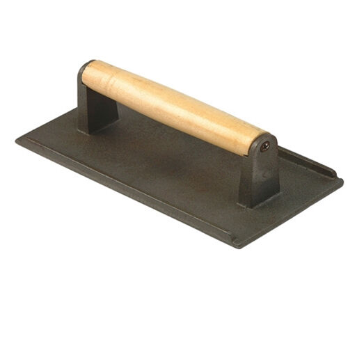 Cast iron with woodenhandle. Speeds up thecooking time on steaks& more.