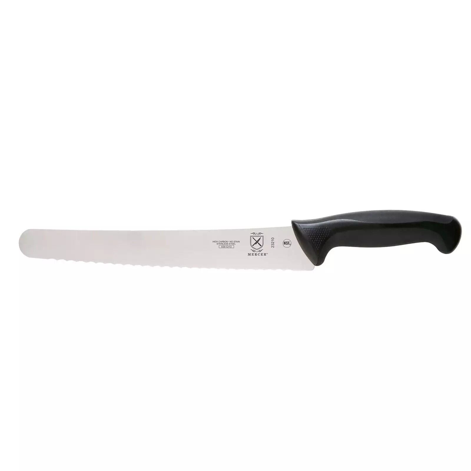 The Millennia® Bread Knife is the perfect addition to your kitchen toolkit. With its 10-inch wide wavy edge, this knife is specifically designed to handle the toughest bread crusts with ease. The blade is stamped from high-carbon Japanese stain-resistant steel, ensuring long-lasting durability and performance. The black non-slip Santoprene® & polypropylene handle features textured finger points and a protective finger guard for a comfortable and secure grip, even during extended use. Plus, this knife is NSF certified, ensuring the highest standards of health and safety. Upgrade your bread-cutting experience with the Millennia® Bread Knife.