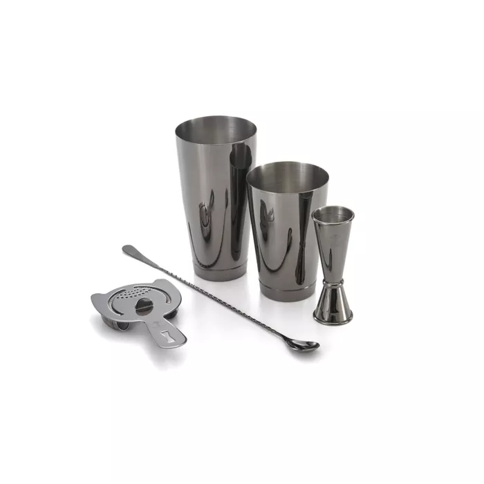 - 5-pieces Include: (1) full size and (1) half size shakers, (1) 1 ounces x 2 ounces jigger, (1) 13-3/16" bar spoon, (1) heavy-Duty spring bar strainer