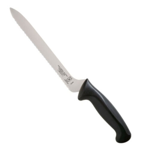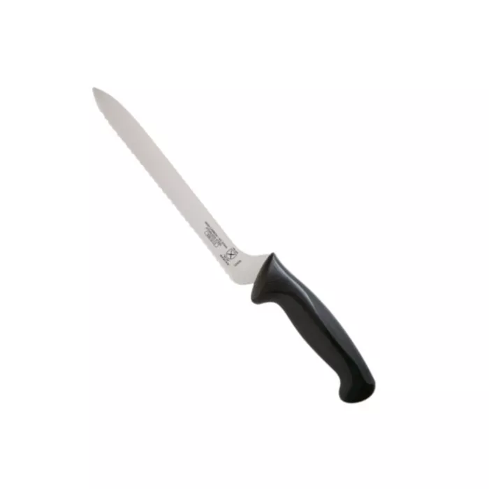 Offset handle provides ample clearance while serrated edge cleanly slices bread or any other food of soft substance with a tough skin or crust.