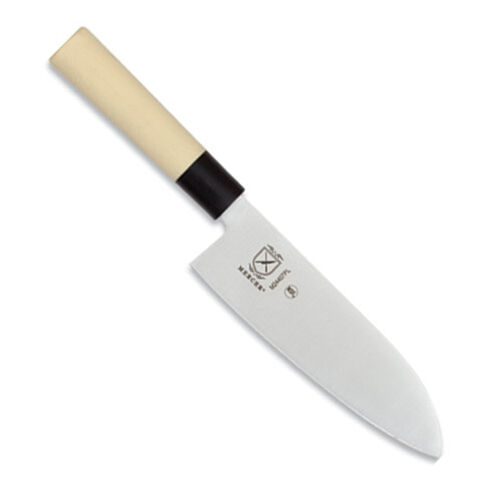 Literally "three-virtues" this all-purpose, Asian-style knife is for slicing, dicing, mincing; Granton edge allows fast, easy cutting. Santoprene® Handle.