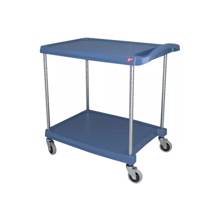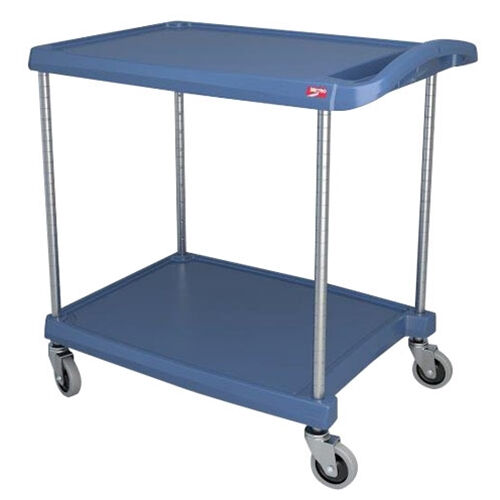 Cart handle has built-in recessed support channel to manage odd shaped items. Right-sized to fit glass and dish racks, bussing totes, silverware bins, milk crates. Chrome posts, 4” non-marking swivel casters. 150lbs capacity per shelf. Designed for your transport needs, making every step count. Available in 2-shelf and 3-shelf configurations. Deep ship’s edge lip around shelf perimeter. Easy no-tool assembly; ships knocked down. Available in gray (G), black (BL), blue (BU) which has built in Microban antimicrobial product protection & allergen purple (AP). NSF listed.