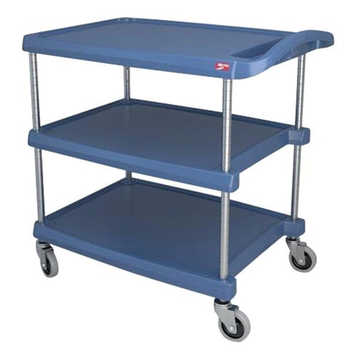 Cart handle has built-in recessed support channel to manage odd shaped items. Right-sized to fit glass and dish racks, bussing totes, silverware bins, milk crates. Chrome posts, 4” non-marking swivel casters. 150lbs capacity per shelf. Designed for your transport needs, making every step count. Available in 2-shelf and 3-shelf configurations. Deep ship’s edge lip around shelf perimeter. Easy no-tool assembly; ships knocked down. Available in gray (G), black (BL), blue (BU) which has built in Microban antimicrobial product protection & allergen purple (AP). NSF listed.