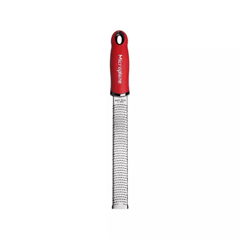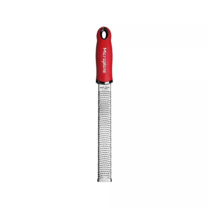 Updated handles for a Classic Zester This version of the classic Microplane zester/Cheese Grater has a premium soft-touch handle and non-scratch end tabs. This tool grates even the hardest Parmesan Reggiano as well as other hard cheeses into fine lacy wisps. Ideal for topping your favorite spaghetti and meatballs or a Caesar salad. It’s also wonderful for effortless citrus zesting to add natural flavors to a lemon crème brulee or a basic vinaigrette