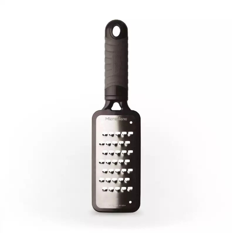 The Home Series is a refreshed and popular paddle-shaped, hand-held cheese grater with an updated handle design that provides greater comfort, stability, and durability. The handle design combines a comfortable, soft-touch material with an overlay of stronger, molded plastic with subtle ribbing for a more secure grip. All Microplane® Home Series Cheese Graters offer a broad grating surface for more room to efficiently get the job done. All are dishwasher-safe and feature razor-sharp surgical-grade stainless steel blades