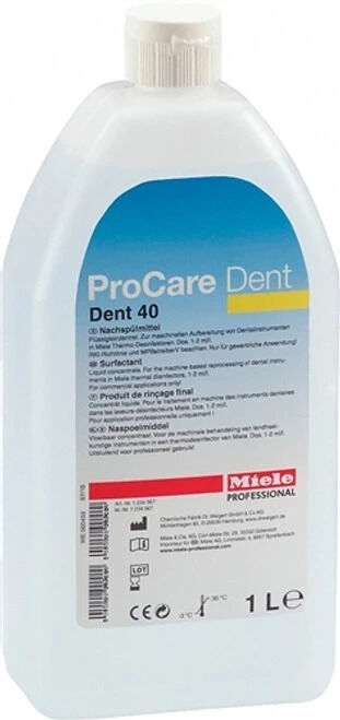Le Miele ProCare Dental 40 est un liquide de rinçage spécialisé conçu pour une utilisation commerciale dans les environnements dentaires et médicaux. Cette bouteille de 1 litre assure un rinçage complet et efficace des instruments, les laissant impeccables et sans traces d'eau ni résidus. Conçu pour fonctionner parfaitement avec les laveurs-désinfecteurs Miele, le ProCare Dental 40 améliore le processus de séchage, garantissant que les instruments sont prêts à être utilisés immédiatement ou à subir un traitement ultérieur.