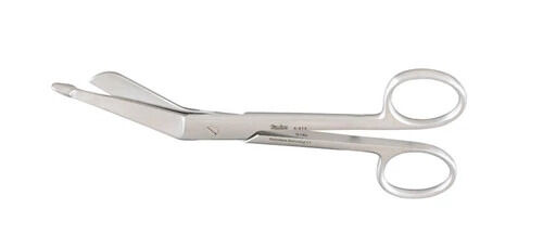 Miltex Lister 5-1/2" bandage scissors with finger ring handle, angled blade, and blunt tips. Standard pattern. German stainless steel.| Brands | Integra Miltex |