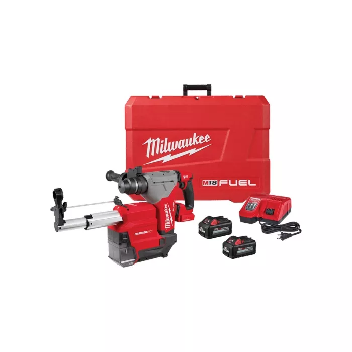 - Comprend : (1) marteau rotatif SDS plus M18 Fuel(MC) 1-1/8" avec One-Key(MC), (1) dépoussiéreur spécialisé Hammervac(MC) 1-1/8", (2) blocs-piles M18 Redlithium(MC) High Output(MC) XC6.0, (1) chargeur rapide M18(MC) et M12(MC)
