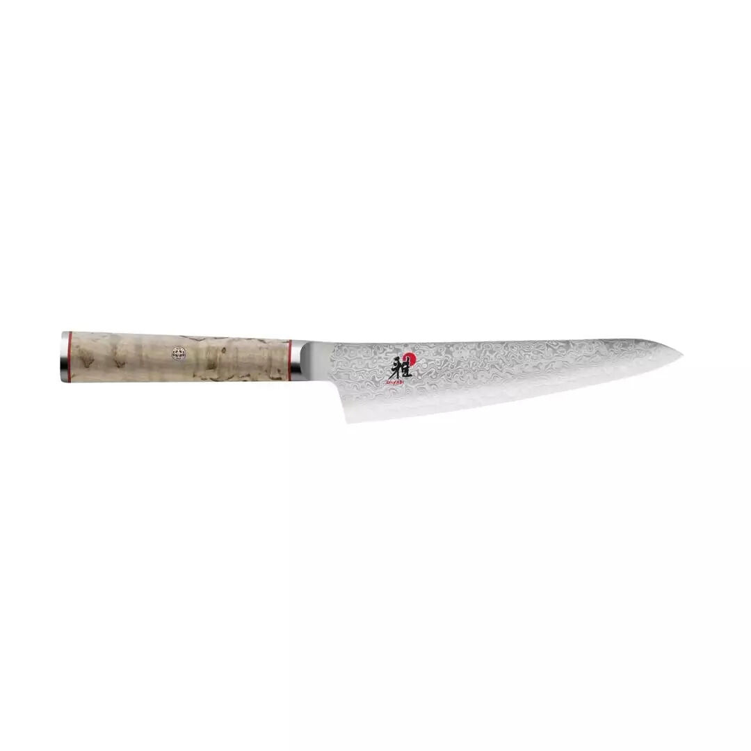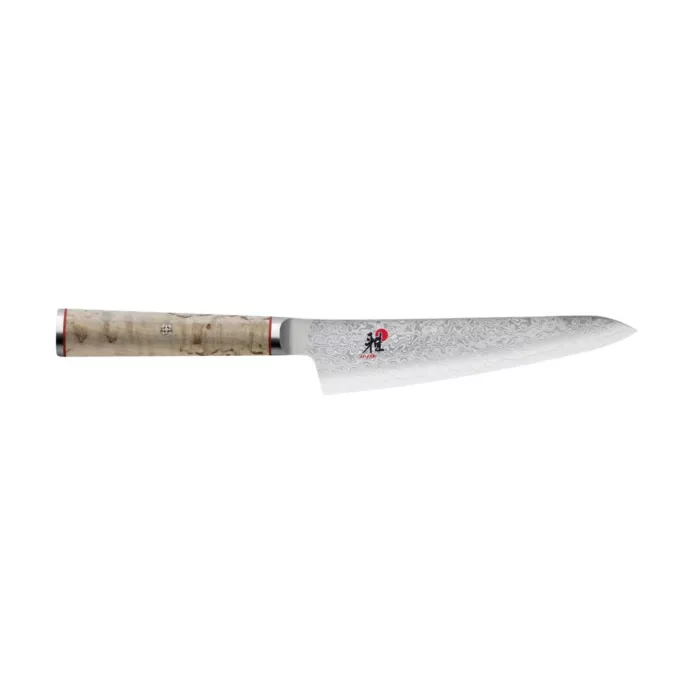 Top-of-the-line MIYABI Birchwood is a work of culinary art. Both blade and handle are crafted from the most precious materials, which shape their striking appearance. More than meets the eye, the potent core of SG2 micro-carbide powder steel is protected by 100 layers of steel. MIYABI's innovative, ice-hardening process locks in the long-lasting sharpness of the CRYODUR blades. Beneath its beautiful exterior, the flower Damascus pattern provides added durability. The scalpel-like blade is complemented by an equally striking Karelian (Masur) Birch handle. A prized material for knife handles, Karelian Birch is also the only wood ever used in a Faberge egg. Exquisite and ergonomic, MIYABI Birchwood knives feel as good as they look. Handcrafted in Seki, Japan