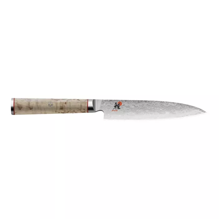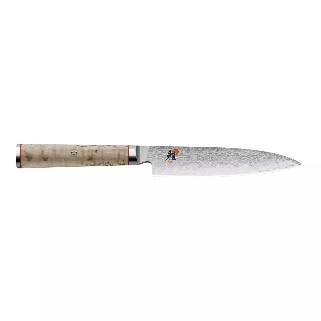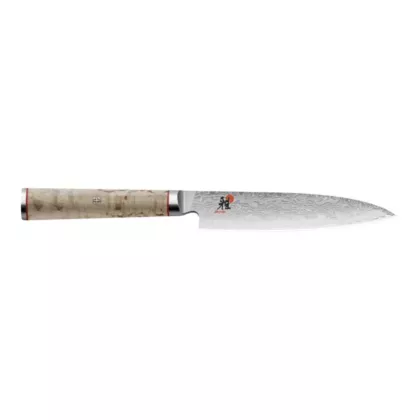 The medium-sized CHUTOH from Miyabi is ideal when you need to slice or cut meat or fish. The thin, stable 16 cm-long blade ensures that you have full control when working: precise working is simple with this knife. This is why it has convinced professional chefs from around the world. The core of the blade consists of MicroCarbide powder steel MC63, surrounded by 100 layers of two different hardnesses of steel. The CRYODUR® blade also undergoes a special ice-hardening process at -196 degrees Celsius giving it a hardness of around 63 Rockwell. The Honbazuke honing is responsible for its extremely scalpel-like sharpness. This sharpness is achieved by sharpening it twice between rotating stones and subsequently polishing it on a leather wheel. The handle has a traditional D-shape, as is usual with Japanese knives. It is comfortable to hold and is a real eye-catching utensil, thanks to its Masur birch handle. Its gentle graining stands out from the floral Damask pattern of the blade and presents a sophisticated contrast. Recesses in the stainless steel and fine red lines create stylish decorative elements. The CHUTOH from the MIYABI 5000MCD series stands out on account of its extreme sharpness.