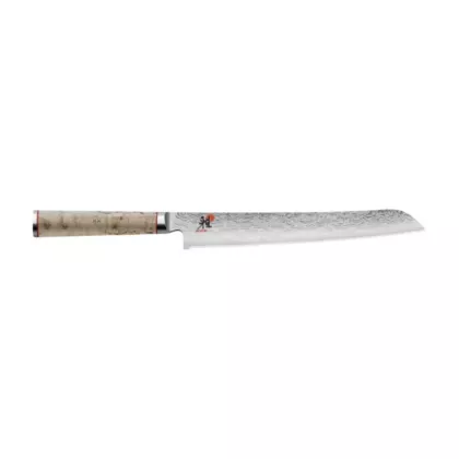 The MIYABI 5000MCD bread knife has a long, strong blade. The serrated edge is able to cut through thick, crusty bread easily and evenly and is ideal for every-day kitchen use. The knife has a traditional, practical design and cuts precisely and efficiently. It also features an impressively ergonomic masur birch handle. The grain of the wood used to make each handle is different, resulting in a truly unique product. The lines and stripes that cross the handle are a key design feature of the MIYABI 5000MCD bread knife. The blade's exceptionally hard core is made from micro carbide MC63 powder steel, a steel of above-average performance that easily meets the requirements of a professional kitchen. The core of the knife is encased by one hundred layers of steel, all of different grades and hardnesses. The blade construction is what sets the MIYABI 5000MCD bread knife apart: state-of-the-art processes ensure a hardness of approximately Rockwell 63 and cutting capabilities of the very highest quality. The unique blade measures 23 cm in length. It can cut through firm bread crusts and easily carve bread into ready-to-serve slices. Optimum performance is ensured by the high-quality materials used to make the knife