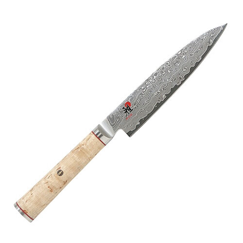 A medium sized knife, slightly larger than a paring knife, used for miscellaneous light cutting such as cucumbers, larger apples or smaller squash and carving medium-sized roasts or poultry. Micro-Carbide MC63 powdered steel core and CRYODUR® vacuum tempered blade. Three-step Honbazuke honing process. 100 layers of stainless steel (50 layers per side) wrap the blade core and are polished to reveal a one-of-a-kind flower Damascus pattern. 63° Rockwell Hardness. Edge Angle: 9.5-12° per side. Traditional Japanese D-shape Birchwood handle enhanced with a mosaic pin and a metal end cap featuring the MIYABI logo. Made in Seki, Japan. Size: 6"/160 m.