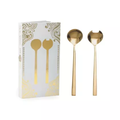 Set of 2 Salad Servers, gold finished stainless steel. Beautifully and neatly packaged in a book-style gift box for easy storage in a drawer or on a shelf.