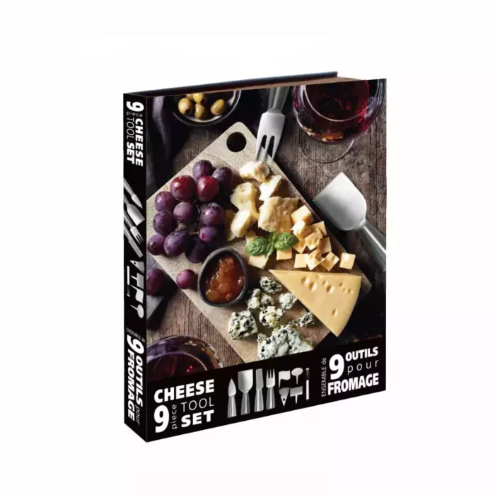 9-piece Cheese Tool Set, stainless steel. Makes for a beautiful and unique holiday gift. Beautifully and neatly packaged in a book-style gift box for easy storage in a drawer or on a shelf. The inside cover includes a cheese reference guide for optimal enjoyment.