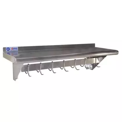 Nella's Stainless Steel 12" x 36" Pot Rack with Shelf & 7 hooks help you store and/or keep your pans and pots organize and accessible. Ideal for busy kitchens, they also have a built-in shelf to hold pot holders, lids, and other kitchen necessities.