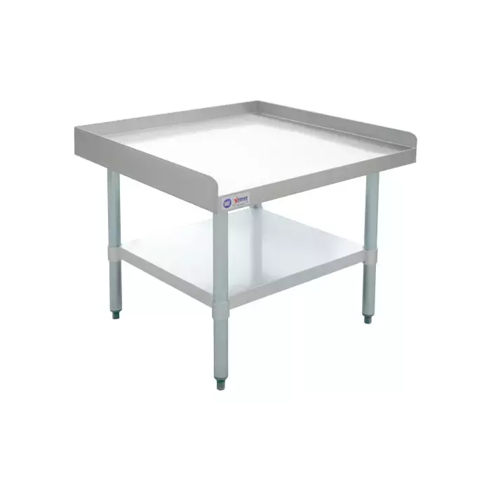 This 30” x 30" kitchen equipment stand is perfect for holding heavy countertop kitchen equipment such as mixers, grinders, slicers, griddles, and burners. Made of durable 18-gauge 430 stainless steel and 18-gauge galvanized steel undershelf, it's built to last. The galvanized legs and socket, as well as the adjustable plastic bullet feet, ensure stability and levelness on any surface.