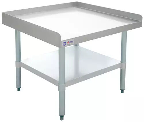 This 30” x 36" kitchen equipment stand is perfect for holding heavy countertop kitchen equipment such as mixers, grinders, slicers, griddles, and burners. Made of durable 18-gauge 430 stainless steel and 18-gauge galvanized steel undershelf, it's built to last. The galvanized legs and socket, as well as the adjustable plastic bullet feet, ensure stability and levelness on any surface.