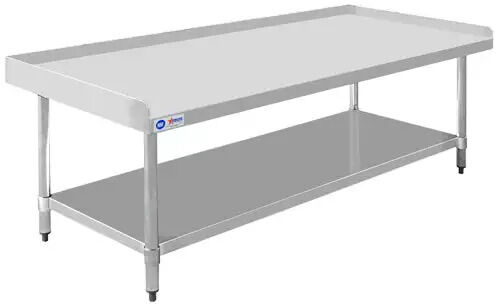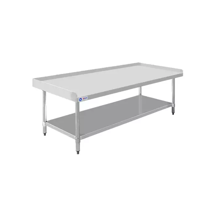 This 30” x 72" kitchen equipment stand is perfect for holding heavy countertop kitchen equipment such as mixers, grinders, slicers, griddles, and burners. Made of durable 18-gauge 430 stainless steel and 18-gauge galvanized steel undershelf, it's built to last. The galvanized legs and socket, as well as the adjustable plastic bullet feet, ensure stability and levelness on any surface.