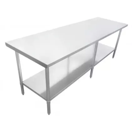 Our 30” x 96” All Stainless Steel Worktable is a durable and sturdy addition to any kitchen. Made from 20-gauge 430 stainless steel material, this worktable is built to withstand heavy equipment and frequent use, making it ideal for kitchen preparation tasks. The 20-gauge 430 stainless steel undershelf, hat channel, leg, socket, and bullet feet all add to the strength and stability of the table, allowing it to support a weight of 1598 lbs/ 725 kg. The worktable is very easy to assemble, and its smooth surface makes cleaning a breeze.
