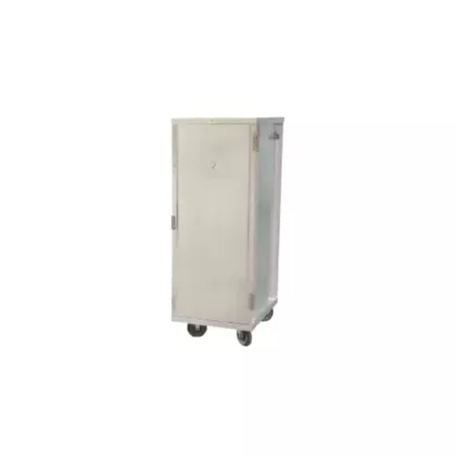 Constructed in aluminum. The door is supported by stainless steel hinges that allow it to open 270 degrees. 5" heavy duty casters allow for easy mobility. The spacing between the slides is 1.5" and all cabinets support standard 18" x 26" pans. Fully assembled.