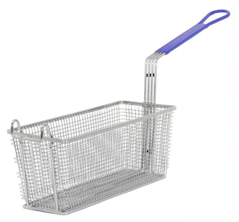 Our deep fryer baskets are specifically designed for heavy-duty commercial applications. It is made from nickel-plated iron for long-lasting strength. The handles are wrapped with heat-resistant plastic for protection. The basket comes with an integrated hook for easy draining and storage.