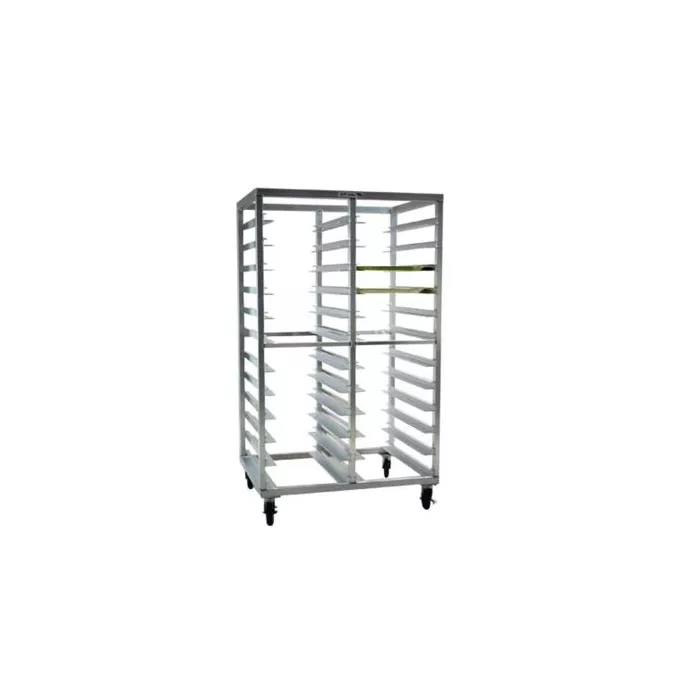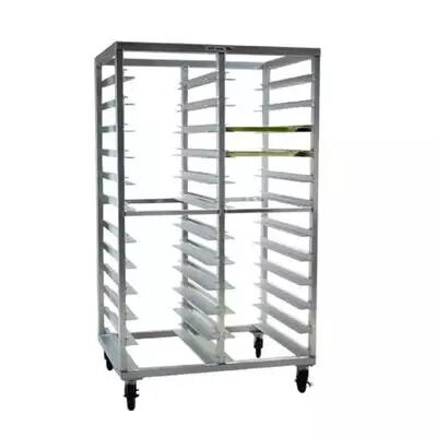 Transport/Retrieval Rack, mobile, full height, open sides, holds (48) 13" x 18" or (48) 14" x 18" trays or (24) 18" x 26" pans or (48) 14" x 18" trapezoid trays, 5" angle spacing, aluminum construction, end loading, 5" platform swivel casters (2 with brakes)