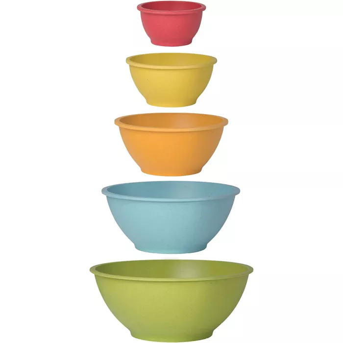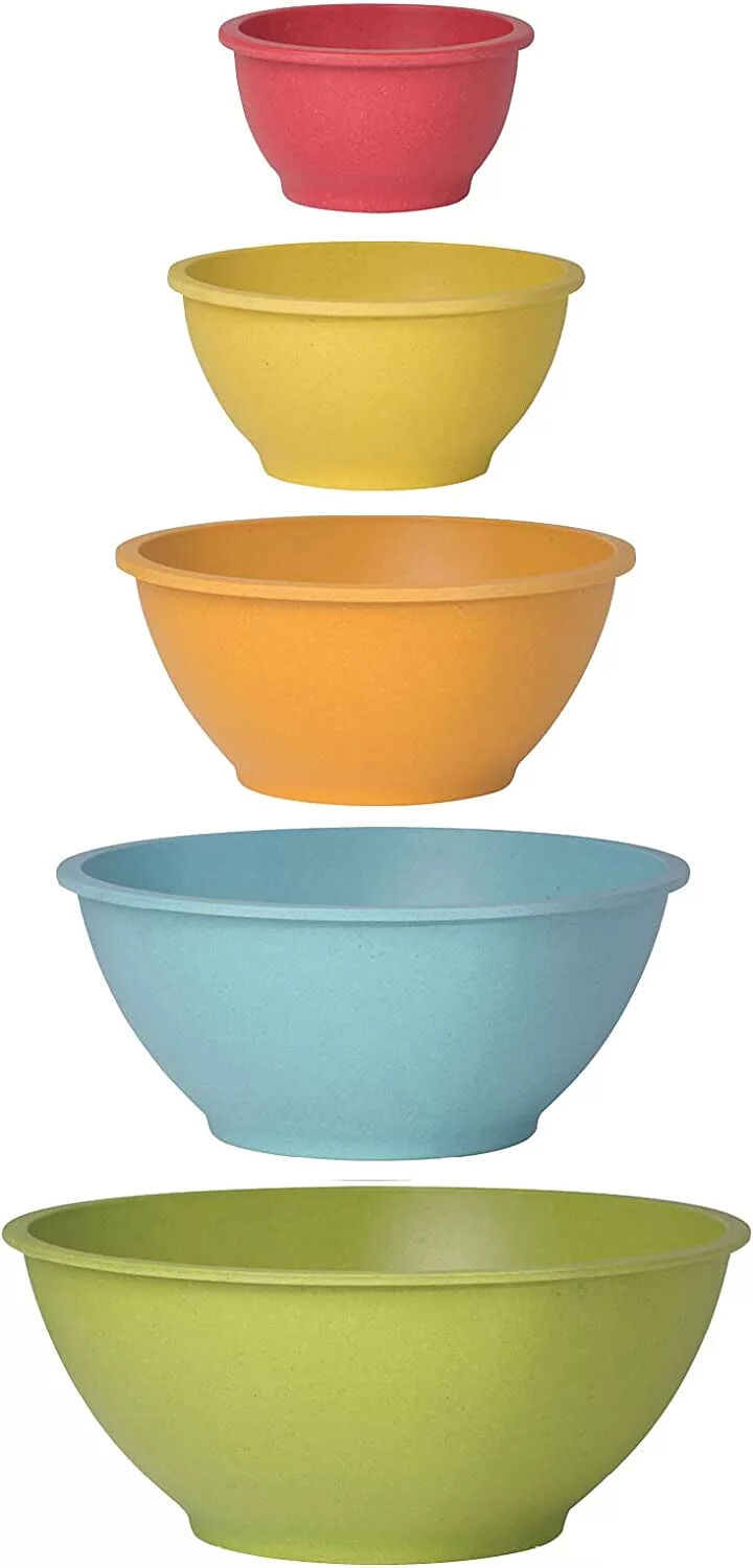 Created from crushed bamboo and melamine, these colorful nesting bowls fit snugly for space-saving storage.