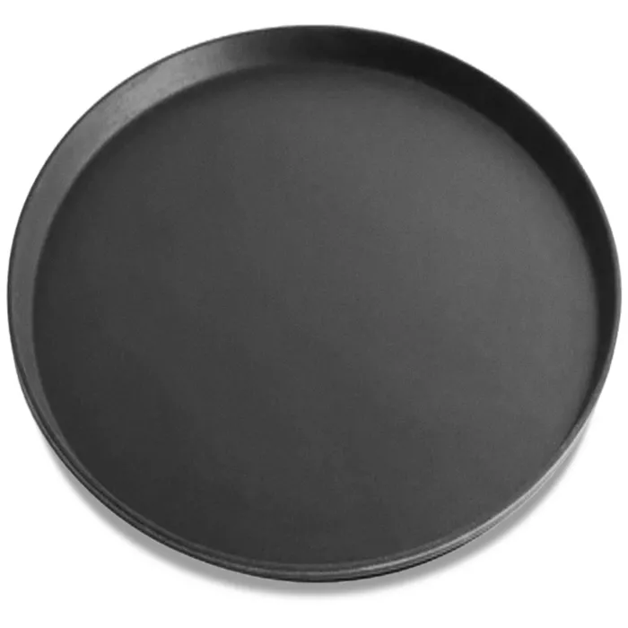 The surface of the tray (top and sidewall) is coated in a rubber-like material that keeps glass and dinnerware from slipping. The tray itself is made of plastic. Withstanding temperatures up to 150ºF /65.55º C ; hand-washing is recommended. Our most economical non skid serving tray.