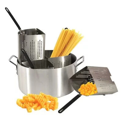 20 QT, 14” x 7” Aluminum Pot, Thickness: 3.6mm, 4 Stainless Steel Inserts with Silicone insulated handle (Hold up to 3 servings of pasta), The included inserts each have a hanging clip for simple draining