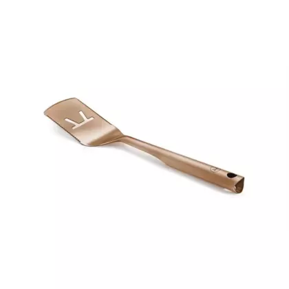 This 16-inch copper grill spatula is a brilliant example of elevated, durable design. Completely weatherproof, these Copper Lux tools are strengthened using a process called physical vapor deposition (PVD) which is well-known in the luxury watch business. The stainless steel design is reinforced with a even coating of copper colored titanium. The result of this process is a beautiful tool that is corrosion resistant and free from chemical binders. You never have to worry about the coating chipping. The thoughtful design of the spatula features one serrated edge for cutting and three tapered edges for easy flipping.