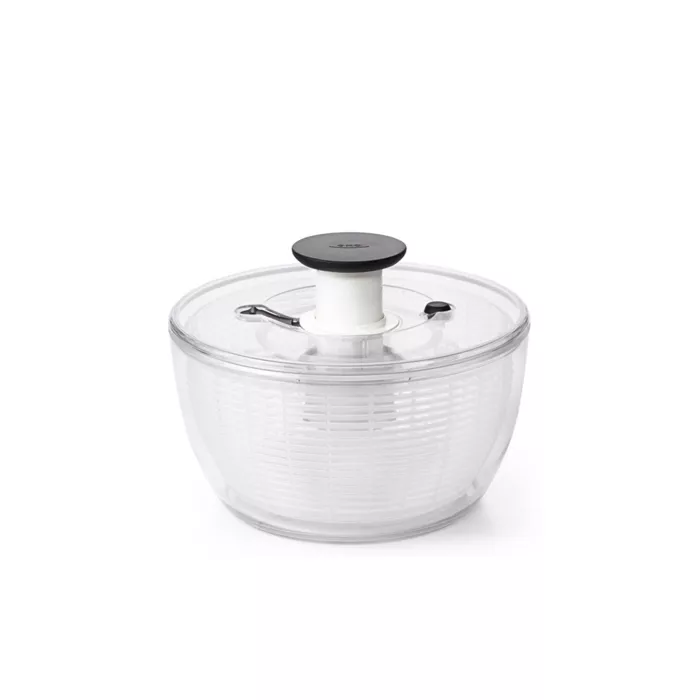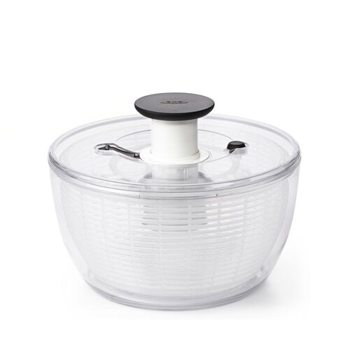 For fast and easy salad preparation, try the award-winning OXO Good Grips Salad Spinner. Simply press the soft, non-slip knob to start the basket spinning. Easy, one-handed operation makes this Spinner a pleasure to use, and a built-in brake stops the Salad Spinner immediately for easy unloading. The bowl doubles as an elegant serving bowl and a non-slip ring keeps the bowl steady on the countertop, even through vigorous spinning at top speeds. For thorough cleaning, the underside of the lid comes apart with the simple press of a button. The lid is flat for convenient storage. Top-rack dishwasher safe.