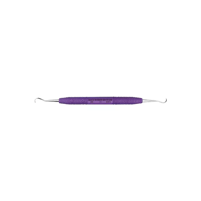 The Jack B. Nimble slim is a slimmer version contra-angled scaler with a continuous curved blade designed for crowded, rotated or lingual-version teeth to better reach interproximal areas. Structured so the increased surface of the cutting edge comes in direct contact with the tooth surface when scaling, it allows practicitioners to apply positive lateral pressure when working in anterior/premolar regions. PDT instruments are ideally weighted, featuring the most ergonomic handle with knurling to the instrument shank to provide increased comfort with less hand fatigue and pinch. PDT's focus on ergonomics greatly reduces the development of musculoskeletal disorders.